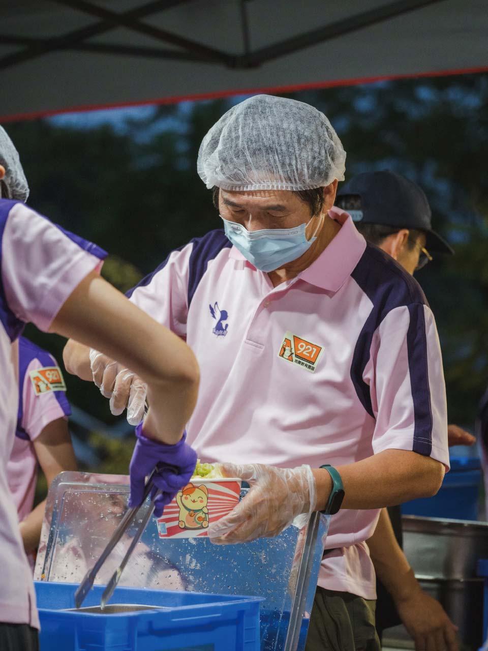 透過 1919食物銀行 及 漢典食品 的料理包,我們得以迅速展開供餐。雖然一開始略顯慌亂,但在一次次的協力中,志工們逐漸找到默契:有人盛飯、有人配菜、有人遞送,每一份餐點都帶著真誠的關懷。民眾除了盛讚晚餐美味,更對這台由萬海航運貨櫃改建的「行動廚房」感到驚艷——災區不間斷的提供熱食,讓救災人員與災民都能安心有力。