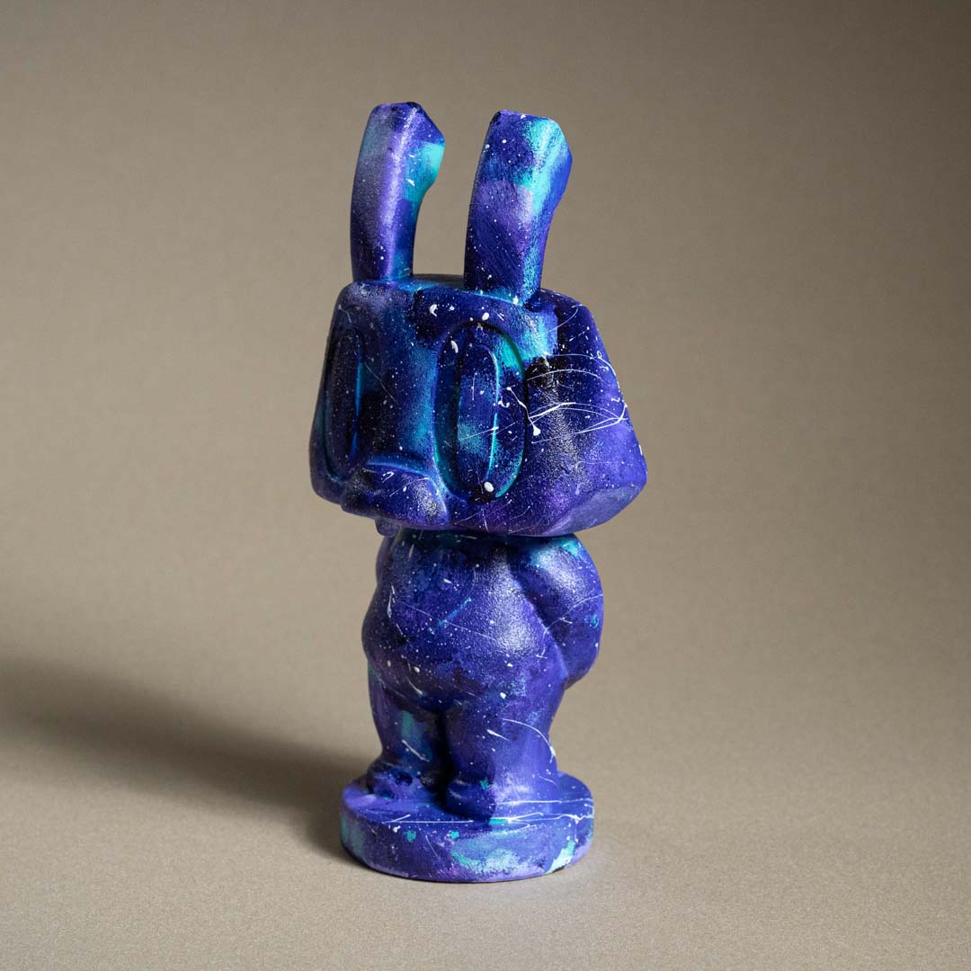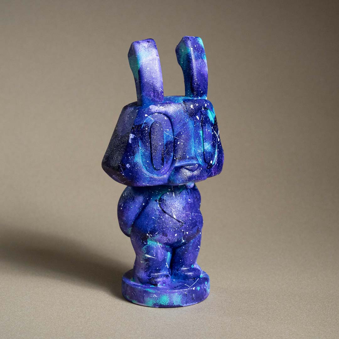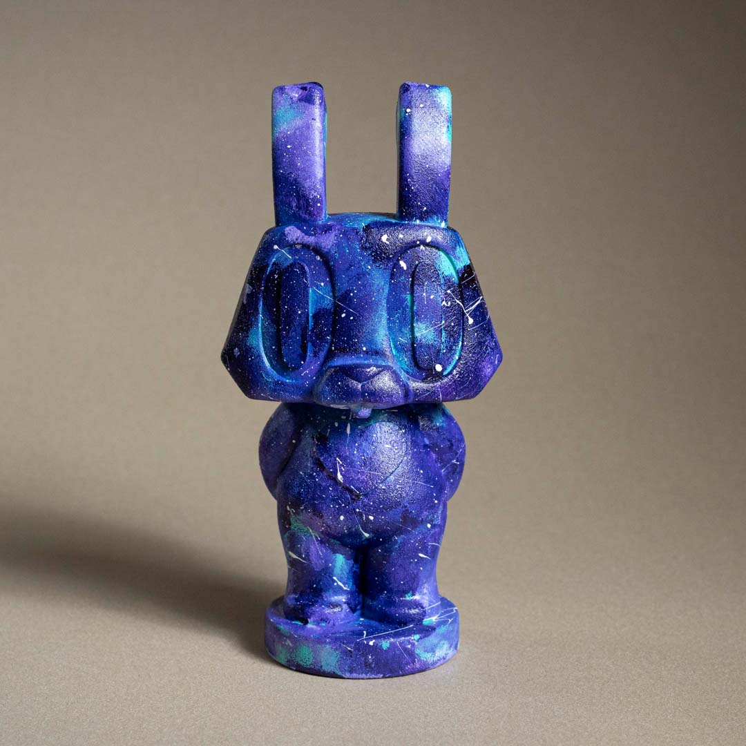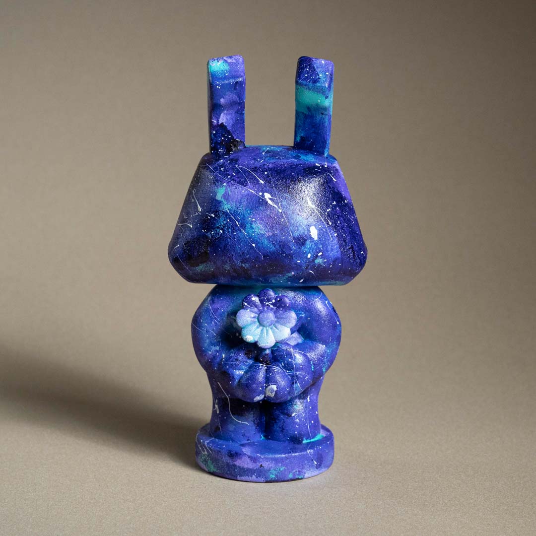 創作理念:這次一看到可愛的棒小兔,就覺得要讓小兔帶來全宇宙的愛分享給大家,所以幫小兔彩繪上充滿宇宙風格的顏色,上面的閃亮星空也寓意著,希望能讓愛閃亮整個宇宙,讓所有的善意都一閃一閃的,點亮需要幫助的角落。