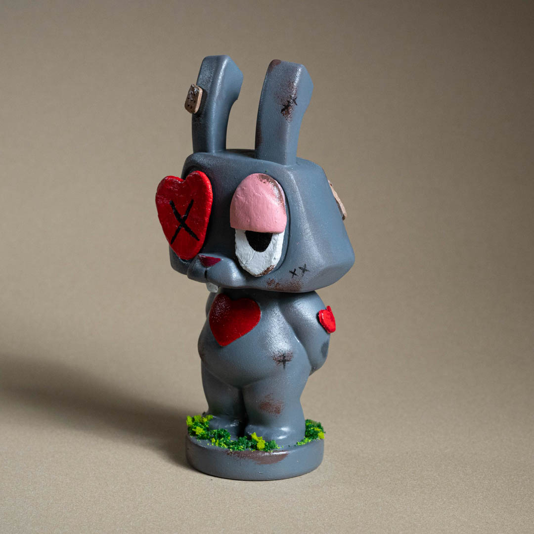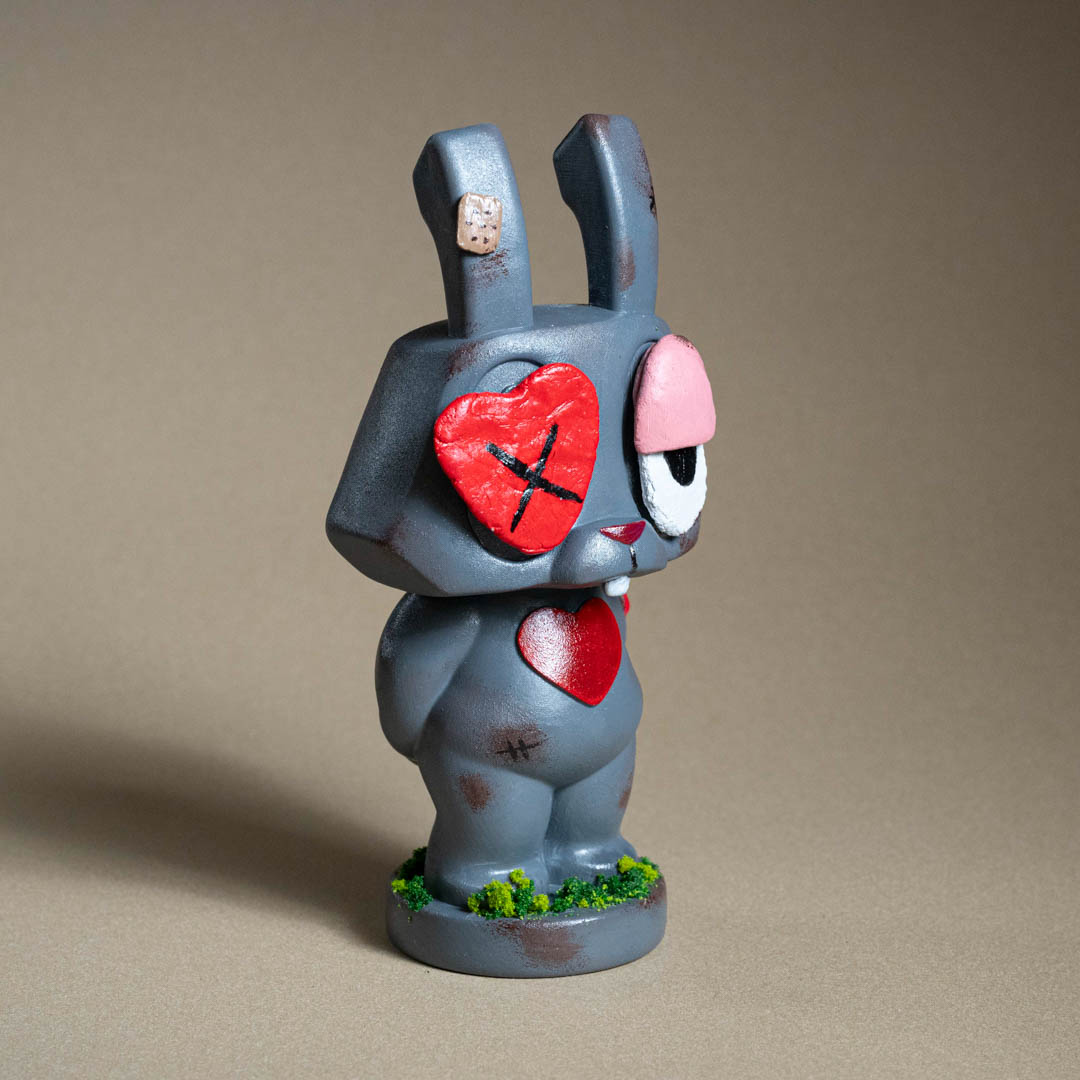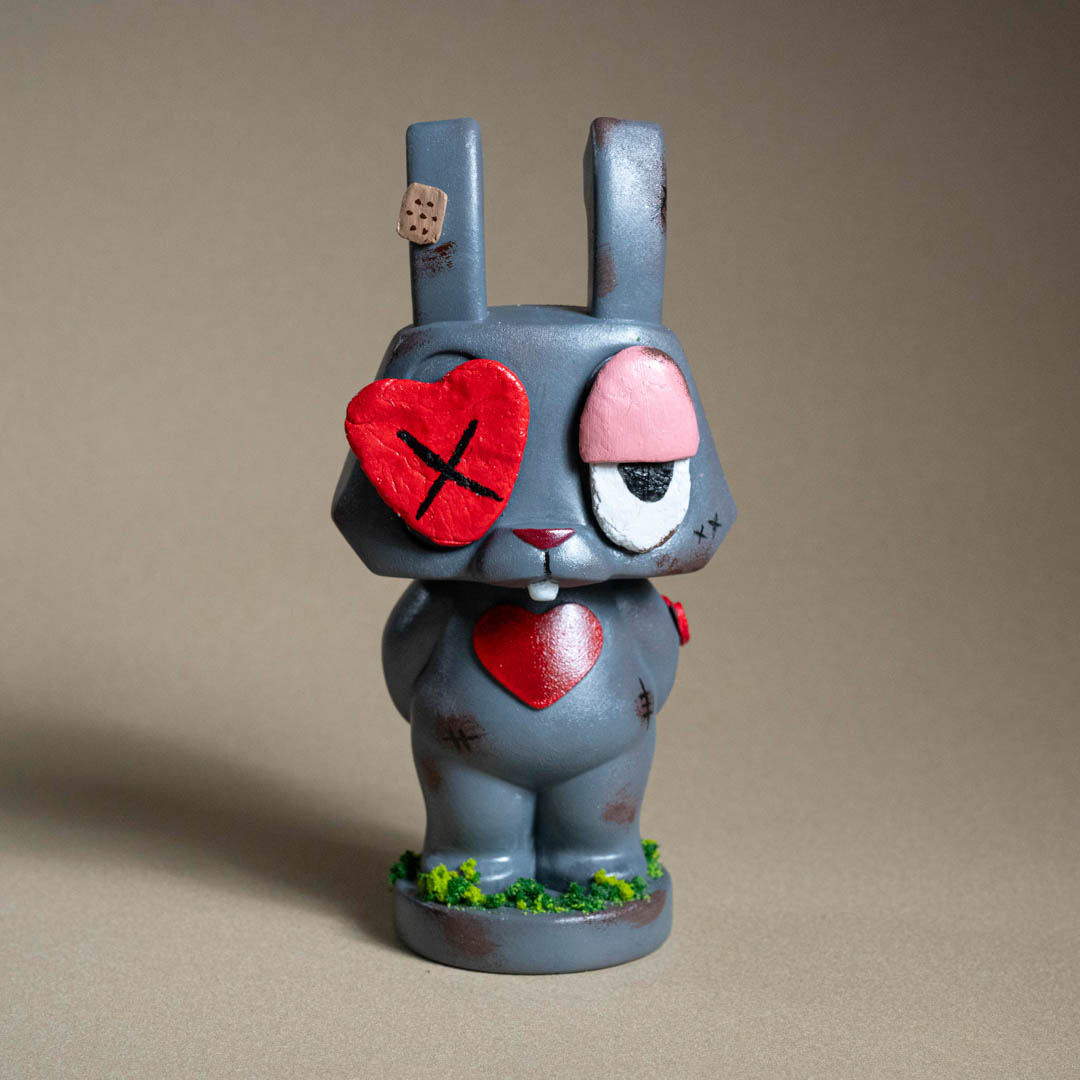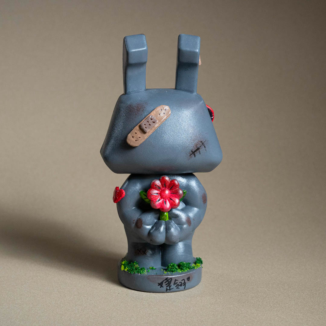創作理念:這次的創作靈感,來自我身邊那些看似堅強、其實也曾被生活劃出傷口的人。我想,每個人心裡都藏著一隻小兔子——牠可能破損、縫補過、甚至貼著幾張 OK 蹦,但仍然願意把手裡的花,遞給世界。在創作這隻公仔的時候,我想到的不是完美,而是那些「仍願意去愛」的人。那些在痛裡長出溫柔、在傷口裡學會擁抱別人的靈魂。我希望這件作品能傳遞給觀眾一個訊息:即使我們不完整、即使曾經受過傷,愛仍然可以被散播、被延續。那朵花,不只是兔子手中的禮物,更像是我們每個人心裡那份「想讓別人好一點」的小小願望。對我來說,創作是一種療癒的行為。它讓我在形塑這隻兔子的過程中,也重新縫合了自己。這件作品,我特別想獻給每一個曾被生活擊倒、卻仍選擇溫柔以待的人。謝謝你們,願意接過這朵花,繼續把愛傳下去。