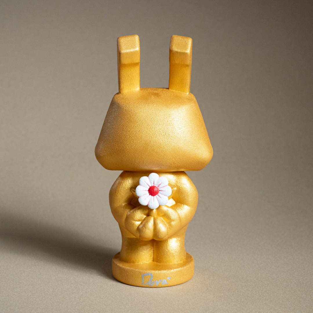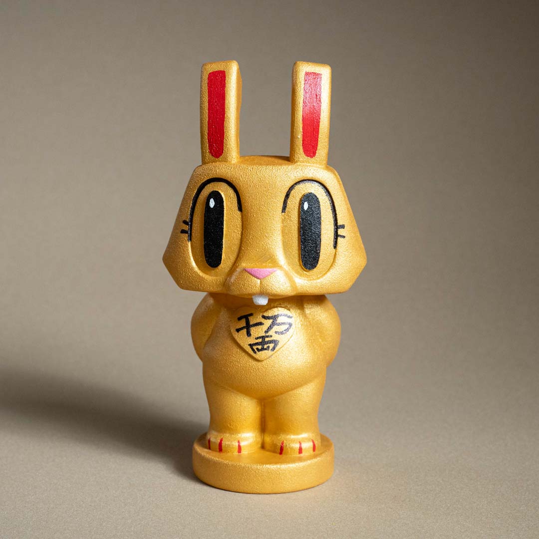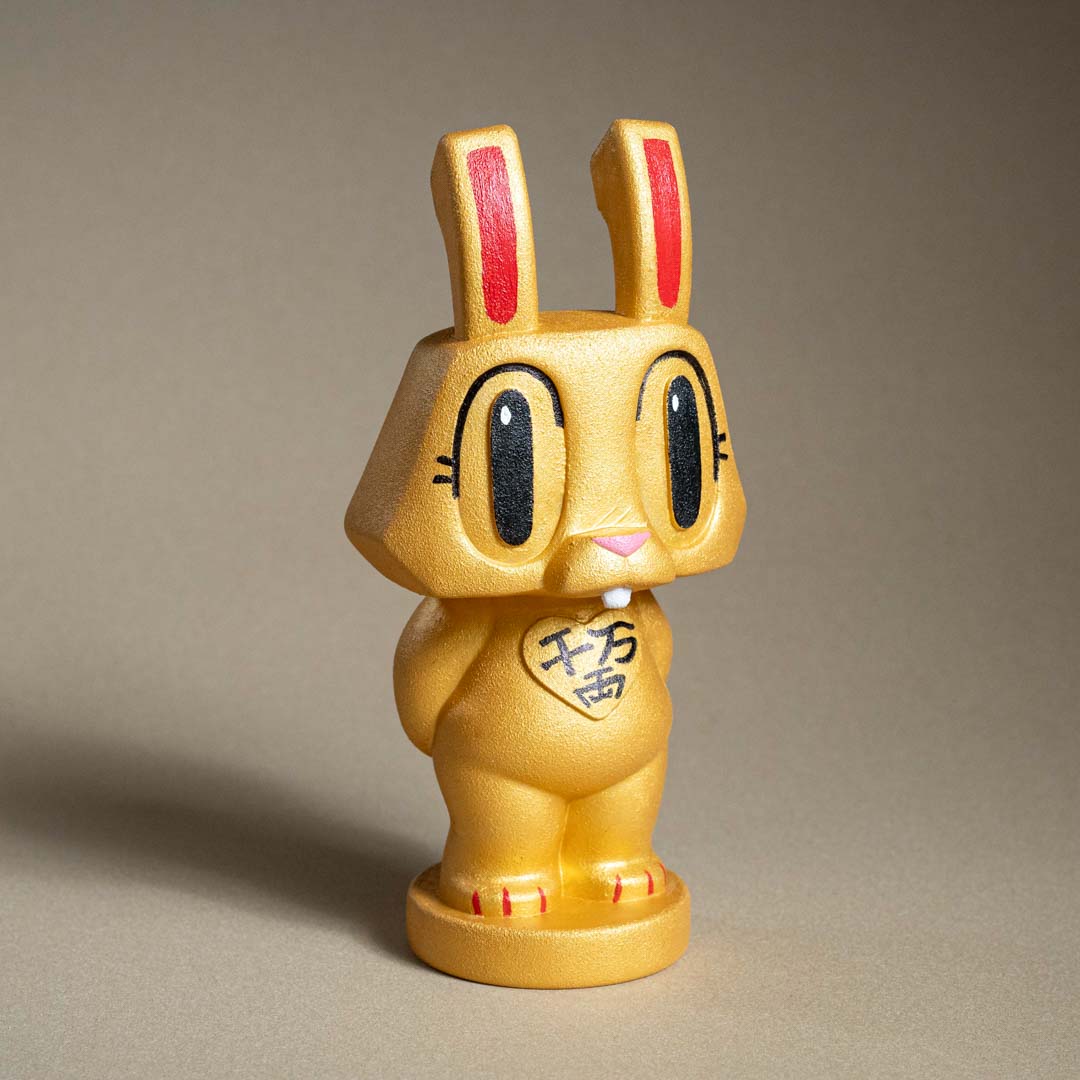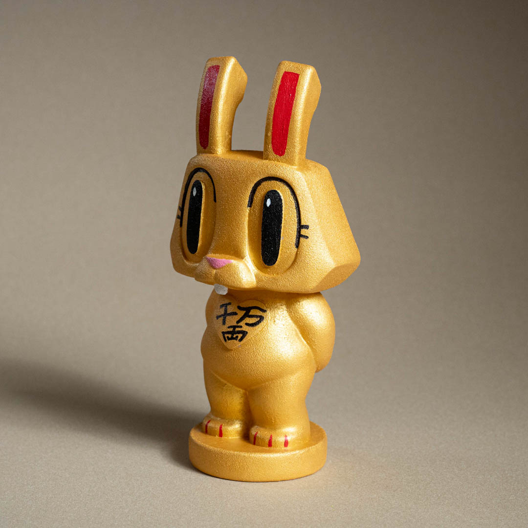 創作理念:我很喜歡到日本旅行,也很喜歡日本的寺廟神社,去年以日本吉祥物達摩做為靈感,創作出了一隻達摩象。今年則取自日本招財貓,創作出招財兔!金色的主體,希望可以帶來財運與好運💛