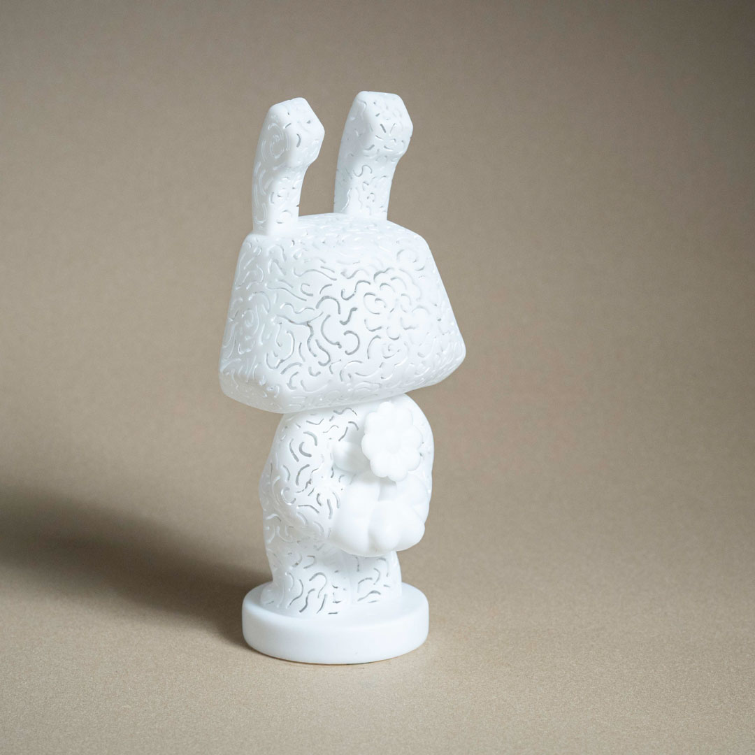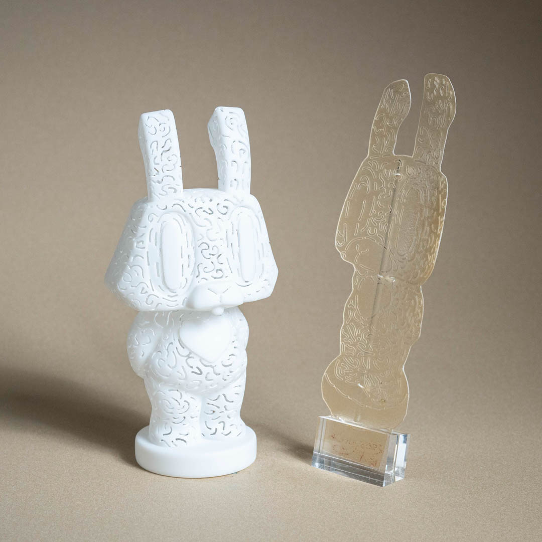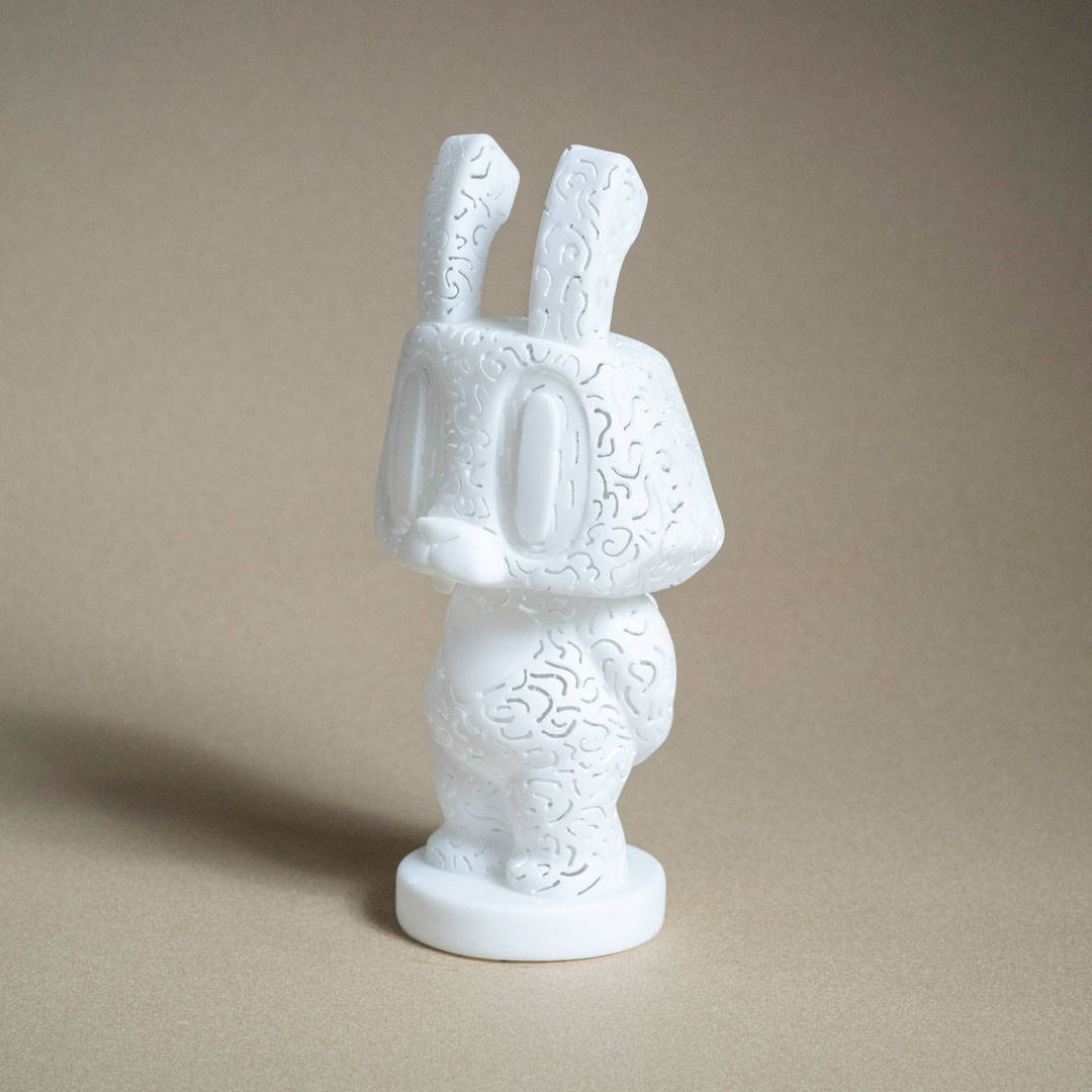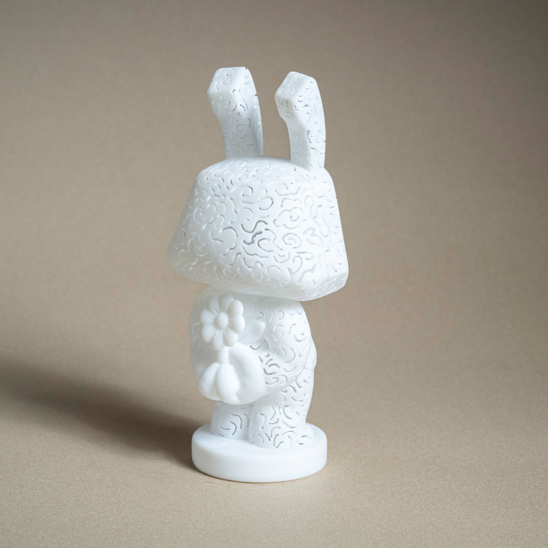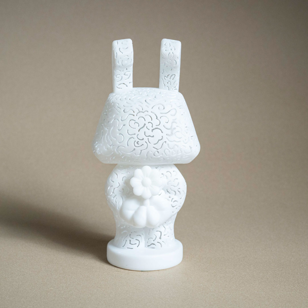 創作理念:我用皮影戲的手法,將雲紋雕刻在公仔上,不只是單純的裝飾,而是延續我對宗教氛圍與神聖感的探索。雲紋在傳統文化中象徵著與天空、神性相連的意涵,當它以鏤空的方式出現在公仔表面時,就像把宗教儀式的符號放進日常物件裡。這種轉化讓公仔不只是玩具,而成為能夠承載信仰痕跡與精神性的載體,在日常中持續提醒我們與神聖的距離。